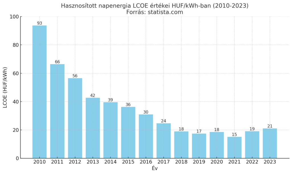 A magyar napenergia szektor fejlődésének egyik kulcsfontosságú szakasza a 2010-es évek elején indult, amikor az Európai Unió zöld gazdasági törekvéseinek köszönhetően számos pályázati lehetőség nyílt meg. Ezek a programok kezdetben elsősorban a mezőgazdasági vállalkozások és a KKV szektor számára kínáltak támogatásokat, amelyek elősegítették a napelemek telepítését. Az állami támogatások hatására a telepített napelem kapacitások dinamikusan növekedtek, ami jelentősen hozzájárult a megújuló energia részarányának növekedéséhez az ország energiamixében. A támogatások létjogosultsága megkérdőjelezhetetlen volt, melyet az alábbi diagramm adatai is alátámasztanak. Az 1. ábrán látható, hogy a naperőművel történő energiatermelés költsége LCOE (Levelized Cost of Energy; azaz rendszer teljes élettartama alatt az 1 kWh energiára eső előállítási költség) hogyan alakult 2010-től kezdődően. A 2010-es évek elején a napenergia előállítása 3-4 szerese volt a mai előállítási költségeknek.