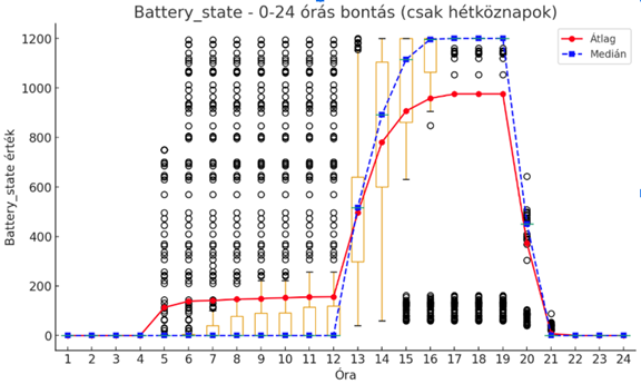 A fenti ábra egy hazai gyártóüzem akkumulátorának napi töltöttségi görbéjét mutatja (SOC – State of Charge):