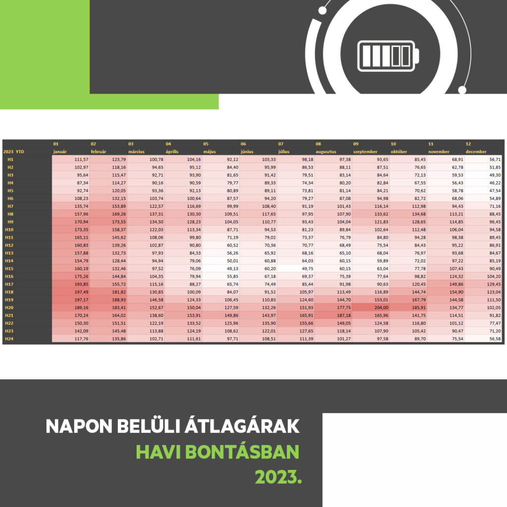 A 2023-as árhőtérkép szerint a legmagasabb átlagárak a téli hónapokban (január–február) jelentkeztek, főként a délutáni és esti órákban (H17–H20), amikor az árak gyakran meghaladták a 150–190 €/MWh szintet. Tavasszal az árak fokozatosan csökkentek, nyáron pedig a nappali órák árai 80–110 €/MWh között mozogtak, összefüggésben a hőmérséklettel és a napelemek termelésével. Az őszi hónapokban (szeptember–november) ismét áremelkedés tapasztalható.