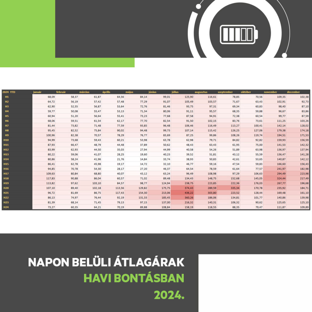 A 2024-es év hőtérképe alapján a tavasz viszonylag stabil volt, ám a nyári és késő őszi hónapokban jelentős árfolyam-ingadozások jelentkeztek. Júliusban és novemberben az esti csúcsidőszakokban (H19–H23) az árak akár 300–436 €/MWh között is ingadoztak, míg a hajnali órákban az árak 70–90 €/MWh között mozogtak. Így a csúcs és völgy közötti különbség akár 250–350 €/MWh is lehet, ami jelentős megtakarítási és profitlehetőséget kínál az energiatárolással rendelkezők számára.